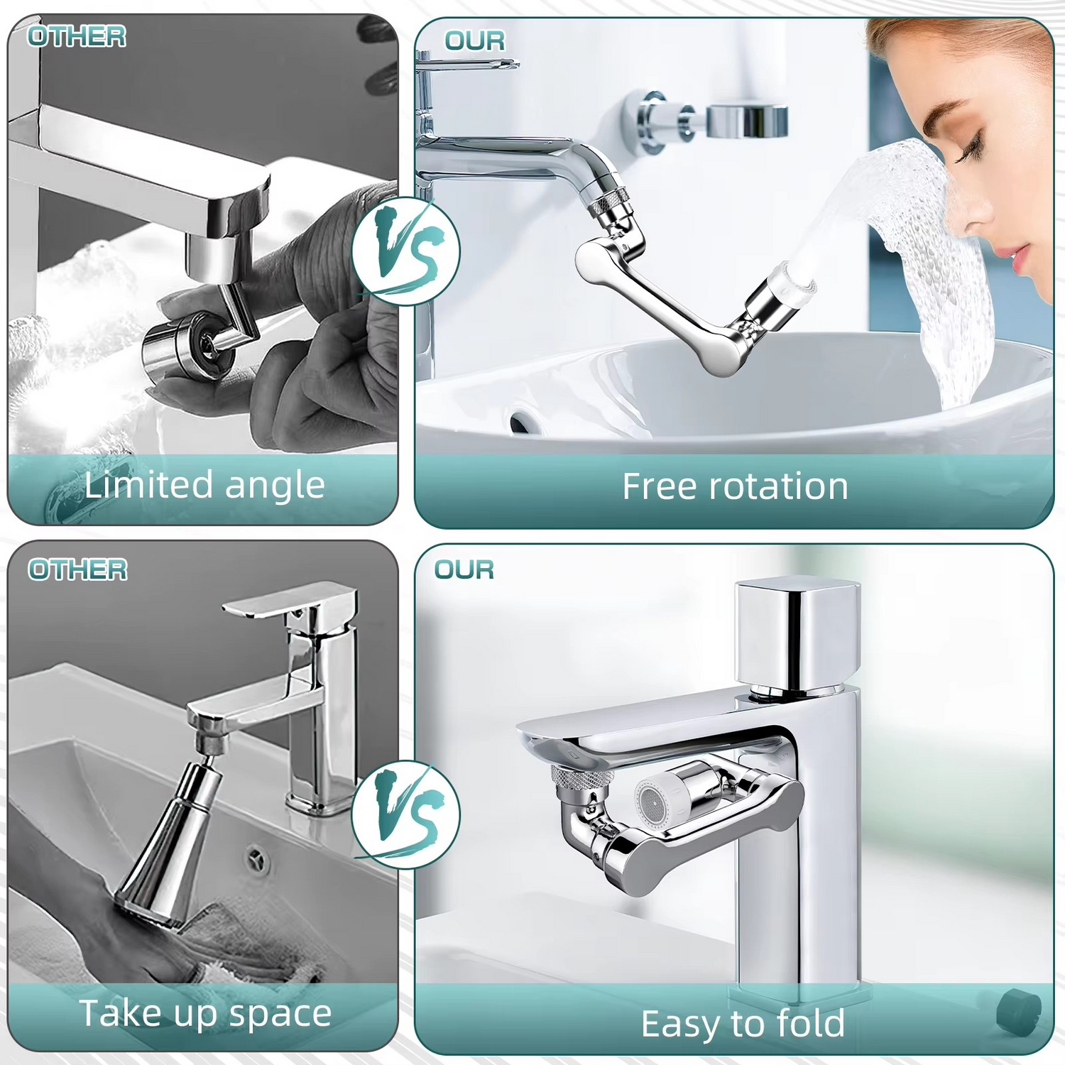 Met de 1080 ° Roterende Kraan Mondstuk Kraanverlenging bespaar je moeiteloos water in je keuken of badkamer. De eenvoudige installatie maakt het toegankelijk voor iedereen, zonder ingewikkelde gereedschappen of loodgietersvaardigheden. Wissel gemakkelijk tussen zachte bubbels en krachtige douchemodi, zodat je precies krijgt wat je nodig hebt op elk moment. Bovendien blijft met de lekvrije afdichting alles netjes en droog. Reduceer je waterverbruik en verhoog het gebruiksgemak in één simpele stap.