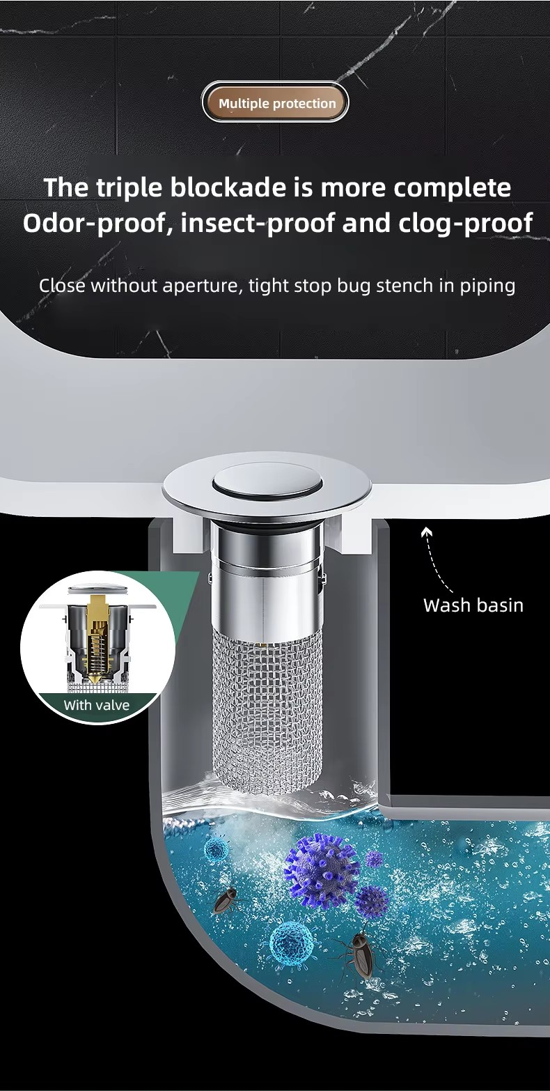 Met de Roestvrijstalen slim pop-up anti-verstoppingszeefje zeg je vaarwel tegen alle lekkageproblemen. Deze innovatieve afvoerstop is eenvoudig te installeren, waardoor je kostbare tijd bespaart. Dankzij de speciale geurbeheersingsfunctie blijft je badkamer fris ruiken. Bovendien is het onderhoud een fluitje van een cent, omdat de wasbakstop snel te verwijderen en te reinigen is.