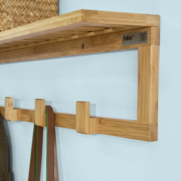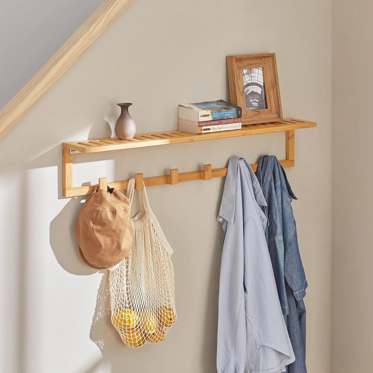 In een druk huishouden kan het lastig zijn om orde en stijl te combineren. Dit bamboe wandrek met 6 haken biedt de perfecte oplossing! Het natuurlijke bamboe is een stevig en milieuvriendelijk alternatief voor hout en geeft je hal een moderne, subtiele uitstraling. Het compacte ontwerp zorgt ervoor dat je ruimte optimaal benut, terwijl je ook nog eens een plank hebt voor je favoriete decoraties. Combineer functionaliteit met schoonheid en maak van elke ruimte een georganiseerde plek.