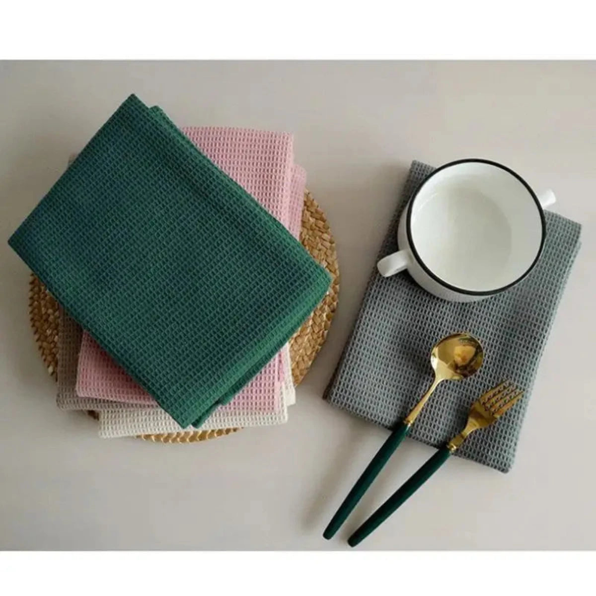 Onze handgemaakte, katoenen wafelstructuur keukendoeken zijn speciaal ontworpen om super absorberend te zijn, zodat het drogen en schoonmaken een fluitje van een cent wordt. Geen vlekken, geen pluisjes, gewoon een schone en droge keuken in een mum van tijd.
