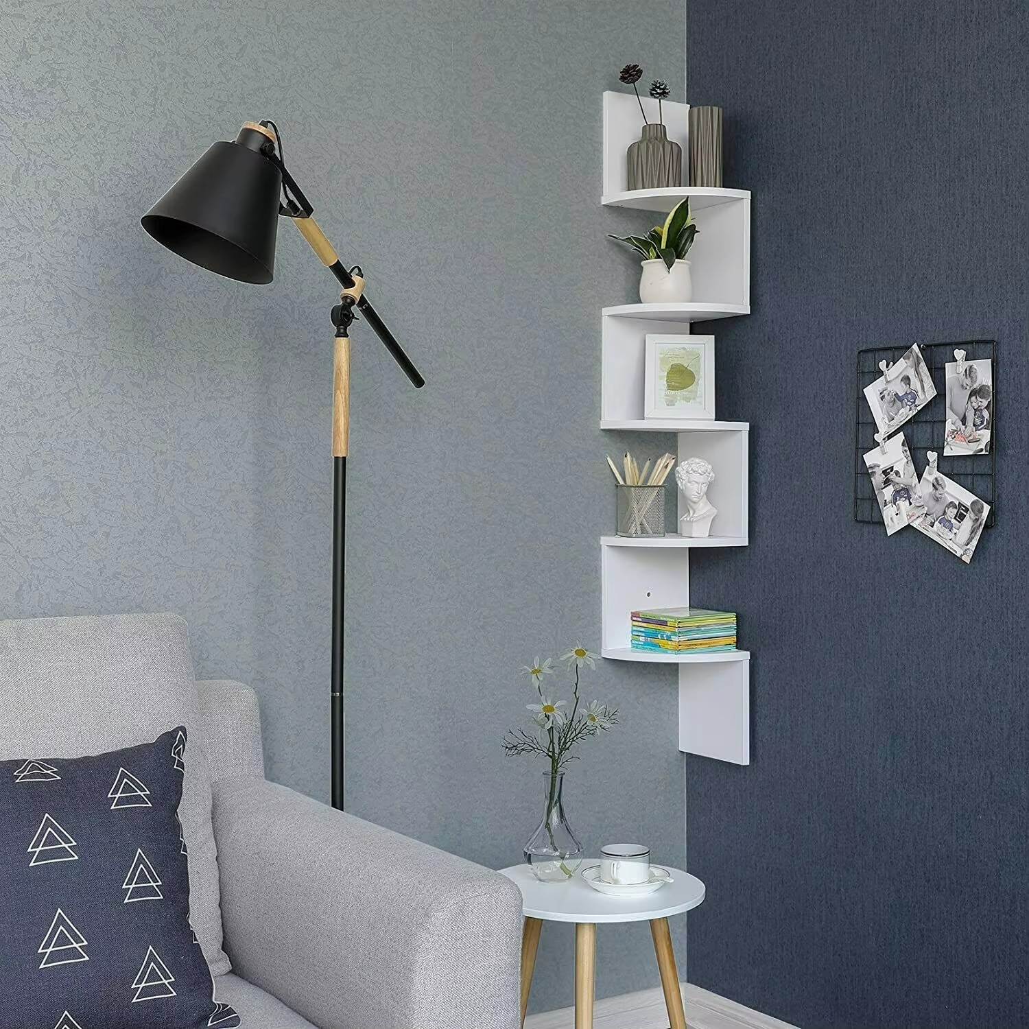 Dit stijlvolle hoekrek is de oplossing voor elk huishouden dat behoefte heeft aan georganiseerde opbergruimte. Met vijf stevige planken biedt het voldoende plaats voor boeken, planten en meer. Het unieke zigzagontwerp voegt karakter toe aan elke kamer en past perfect in elke hoek. Dankzij de stevige constructie en het duurzame materiaal is het rek niet alleen praktisch, maar ook een decoratieve toevoeging aan uw interieur.